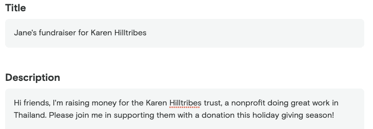 After creating your account or logging in, add a title and description to your fundraiser. For example: